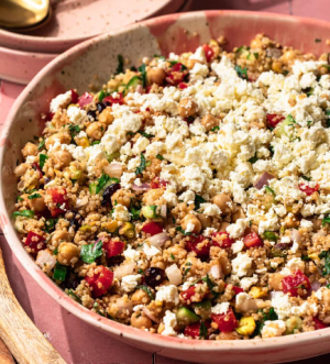 Mélanger les autres ingrédients, sauf le feta. Rajouter la vinaigrette puis le feta.